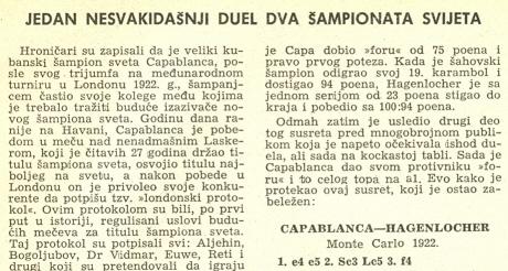 در یک مقاله جالب توجه که در سال 1982 در یک نشریه ورزشی یوگوسلاویایی با عنوان "ساهوسکی گلاسنیک" (صفحات 363-364) منتشر شد، چنین آمده است که پس از اینکه بر سر قوانین لندن درمورد رقابتهای قهرمانی شطرنج جهان به سال 1922 توافق حاصل شد،"کاپابلانکا" به "مونت کارلو" برای استراحت رفت.
